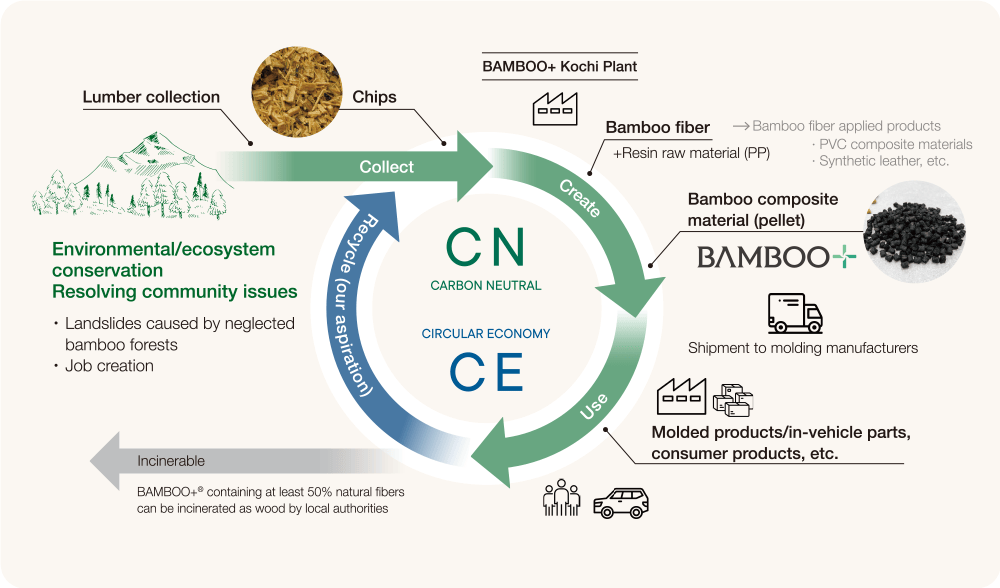 BAMBOO+® is a biomass material made from locally collected bamboo chips that have been converted into fiber using our proprietary technology and then composited with resin for industrial molding use. BAMBOO+® reduces consumption of petroleum-derived materials, given that up to 55% of it is composed of bamboo fiber processed with our proprietary technology. Furthermore, because bamboo grows rapidly and can be used sustainably, it can help reduce environmental impact in numerous ways, from absorbing CO2 during its growth phase to the preservation of satoyama. This project was realized through collaboration with local residents. To achieve a sustainable society, we will continue to develop innovative technologies as a manufacturing company while collaborating with local communities to create products that are kind to both people and the planet.