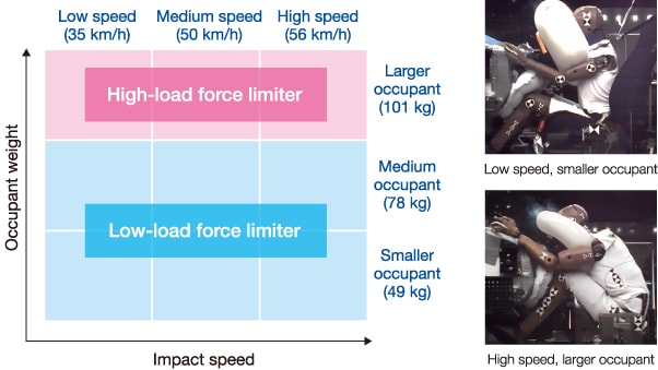 Instantly adjusts the protective load from low to high depending on the occupant’s physique and impact speed