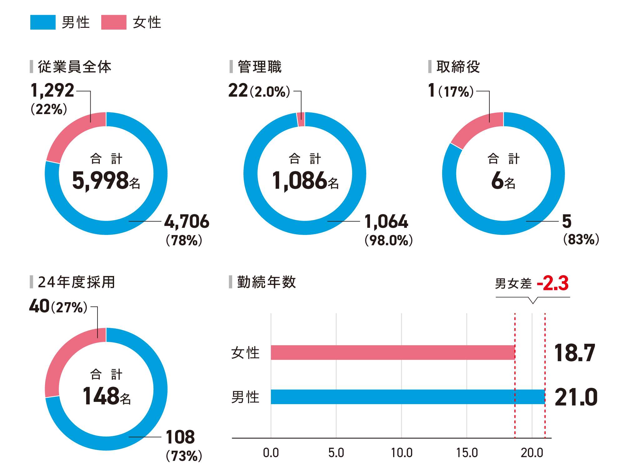 ダイバーシティ&インクルージョンは、経営基盤を支える重要な柱のひとつと捉え、多様な人財が活躍できる制度と組織風土の醸成に取り組んでいます。