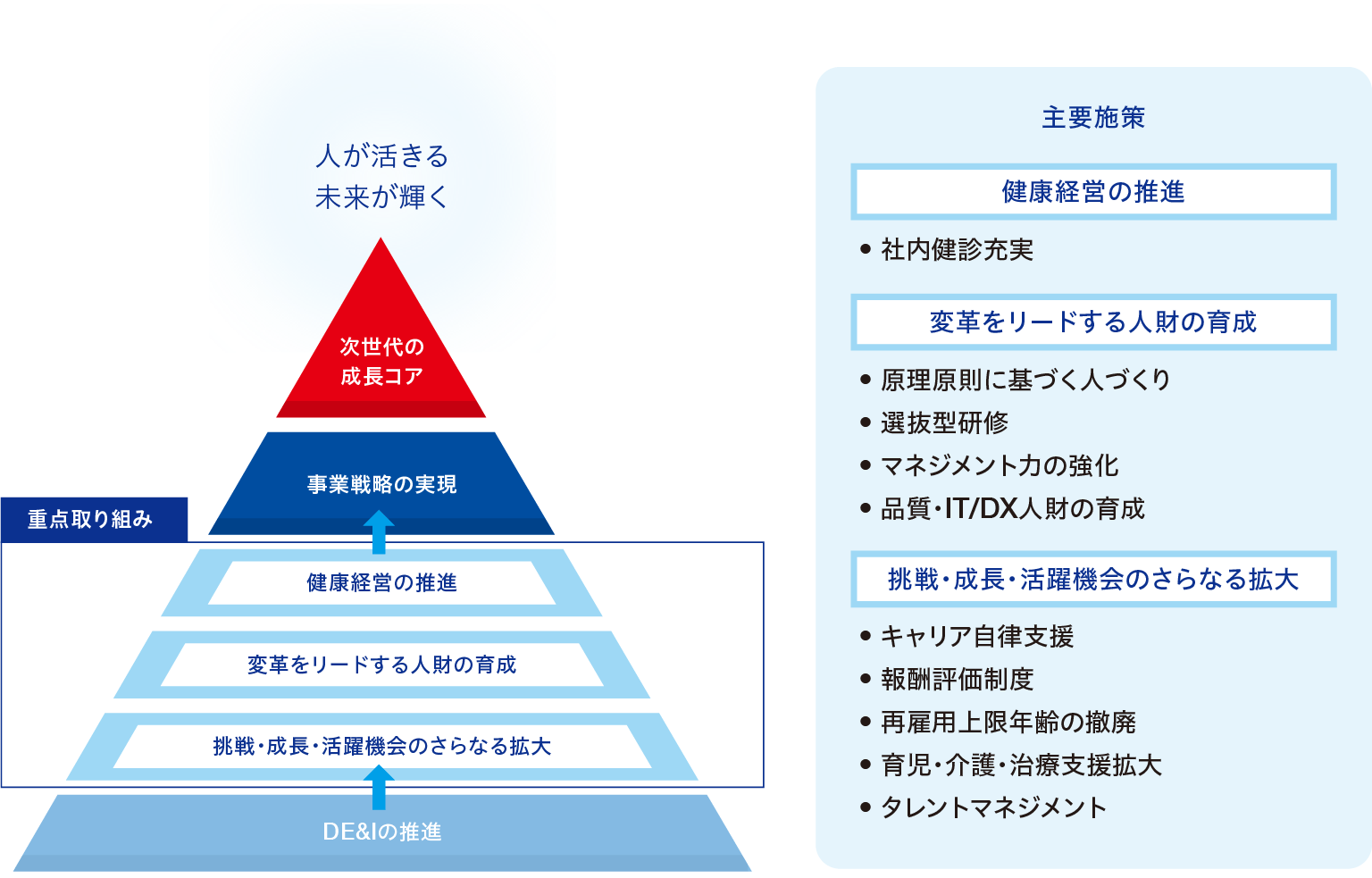 2030年度の目標達成に向けて、当社は「人的資本経営」のさらなる進化を図ります。急速な環境変化や技術革新が進む中、企業の持続的成長には、社員一人ひとりの能力と意欲を最大限に引き出し、組織全体の変革力を高めることが不可欠です。そのため、以下の重点項目を掲げ、2030年度に向けた目標の達成と企業価値の持続的向上をめざします。