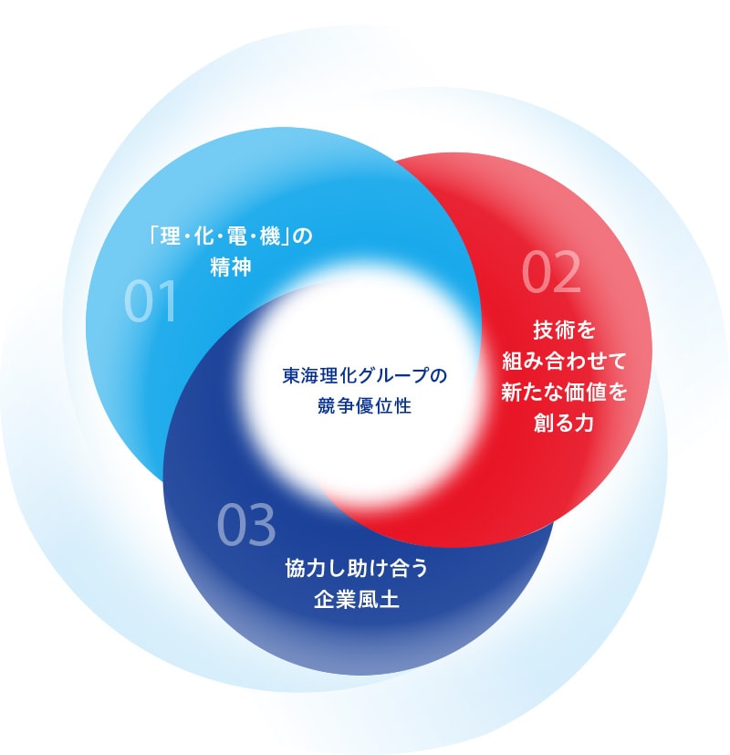当社の正式名称「東海理化電機製作所」の「理化電機」は、「物理・化学・電気・機械何でもやる」「生産力・技術力・販売力・資本力のバランスがとれた会社にする」という創業者の想いが込められています。